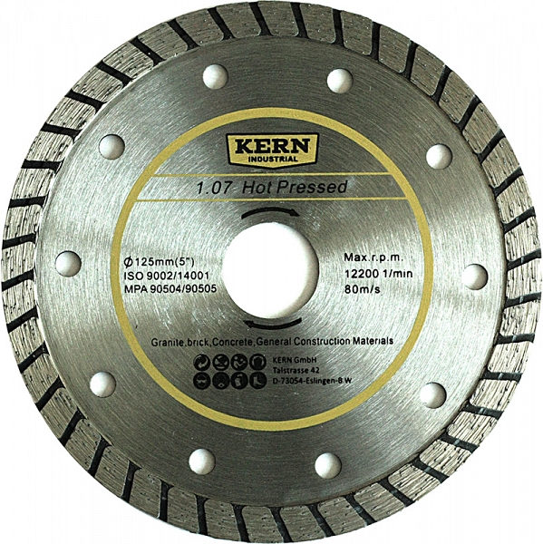 Алмазный диск Kern 1.07 Hot Pressed Turbo 230 мм (Керн 1.07 Хот Прессед Турбо 230 мм) – отрезной сплошной (с гофрированным сплошным алмазным слоем) алмазный круг для сухой и мокрой алмазной резки бетона, кирпича, гранита, а также армированного бетона (железобетона), старого бетона, мостового бетона, промывного бетона, бетонных блоков, базальта, порфира, габбро, сланца, клинкера, бордюрного камня, твердого камня, твердых огнеупоров, тротуарной плитки и других общестроительных материалов. Используется на отрезных и ручных углошлифовальных машинах (УШМ, болгарках), штроборезах, бензорезах и электрических резчиках, плиткорезах электрических и другой алмазной технике.