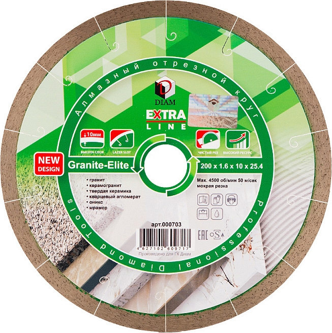 Алмазный отрезной диск Diam Extra Line 1A1R Корона Granite-Elite 200 мм (Диам Экстра Лайн 1А1Р Корона Гранит-Элит 200 мм) – премиальный алмазный круг для мокрой резки гранита, керамогранита, твердой керамики, кварцевого агломерата, оникса, мрамора, габбро, лабрадорита, базальта и других пород твердого натурального камня на болгарках (ушм), штроборезах и плиткорезах электрических с подачей воды. За долгое время зарекомендовал себя с отличной стороны у многих мастеров, как инструмент, обеспечивающий очень качественное выполнение задач практически по всем твердым материалам, при этом имеет очень большой ресурс и скорость работы.