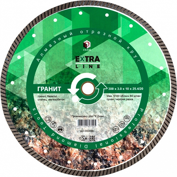 Алмазный отрезной круг Diam Extra Line Turbo Гранит 300 мм (Диам Экстра Лайн Турбо Гранит 300 мм) – специальный алмазный диск тип Turbo для сухой и мокрой резки гранитов, базальта, сланца, железобетона и других твердых материалов.