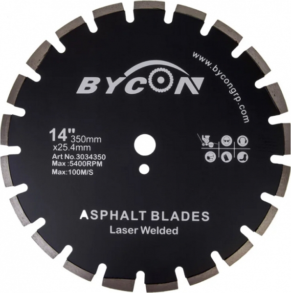 Алмазный сегментный диск Bycon Laser Asphalt 350 мм (Байкон Лазер Асфальт 350 мм) применяется, как правило, на бензорезах, электрических резчиках, камнерезных станках, стенорезных машинах и швонарезчиках. Обрабатываемые материалы: асфальт, мягкий силикатный кирпич, цементная стяжка, абразивный бетон, мягкий песчаник и другие абразивы.