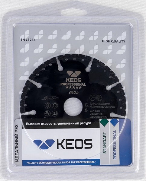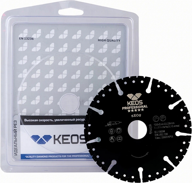 Диск алмазный универсальный Keos Professional 125 мм (Кеос Профессионал 125 мм) предназначен для резки металлов, пластика, резины, бетона, армированного бетона (железобетона), кирпича, древесины и т.д. ушм (болгарками), штроборезами, системами резки крупноформатной плитки, как с подачей воды, так и всухую. Подходит для универсального использования, аварийно-спасательных работ и многого другого.