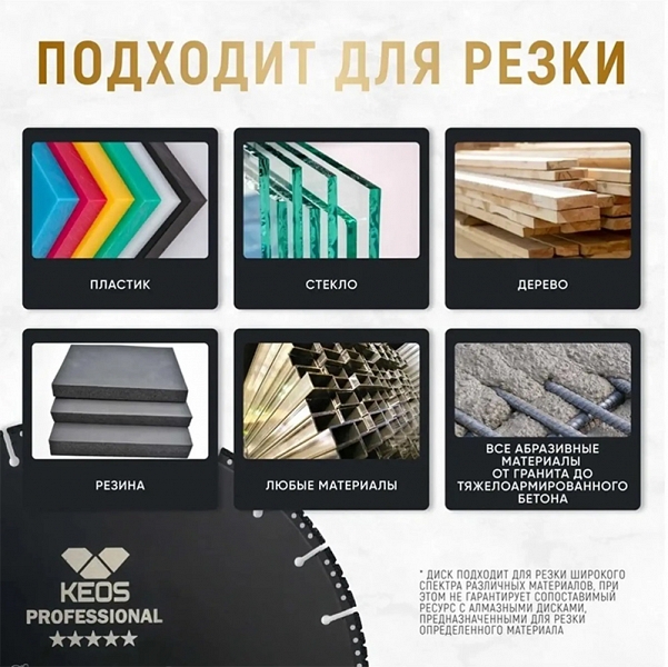 Диск алмазный универсальный Keos Professional 230 мм (Кеос Профессионал 230 мм) предназначен для резки металлов, пластика, резины, бетона, армированного бетона (железобетона), кирпича, древесины и т.д. ушм (болгарками), штроборезами, бензорезами, электрическими резчиками и плиткорезами, стенорезными машинами, как с подачей воды, так и всухую. Подходит для универсального использования, аварийно-спасательных работ и многого другого.