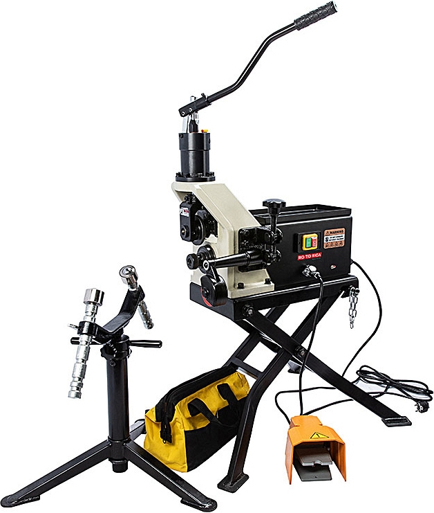 Электрический гидравлический желобонакатчик Rotorica RG-1S (Роторика РГ-1С) – с модернизированным ручным гидравлическим насосом – грувлочный желобонакаточный станок с модернизированной ручной гидравлической подачей накатывающего ролика для накатки канавок (желобков) на углеродистых стальных трубах из углеродистой стали Ø 1" – 8" (25 – 200 мм) sch. 7/10/20/40 и нержавеющих стальных трубах из нержавеющей стали Ø 1" – 8" (25 – 200 мм) sch. 40, толщиной стенки до 8 мм при монтаже водопроводных, отопительных, пожарных и промышленных трубопроводов без применения сварки. Отличное решение для выполнения больших объемов работ на стройплощадке или в цехе производства.