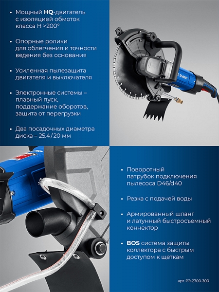Электрический резчик по бетону Зубр Профессионал РЭ-2700-300 (Zubr Professional RE-2700-300) предназначен для наиболее трудных и глубоких (до 100 мм) резов любых материалов – бетона, асфальта, бордюров, металла, кирпича. Высокая мощность двигателя в сочетании с передаточным отношением редуктора дает большой крутящий момент на валу, что позволяет резать быстро и эффективно. Эффективный пылеотвод или работа с подачей воды защищают компоненты от пыли.