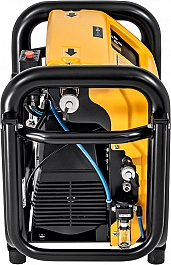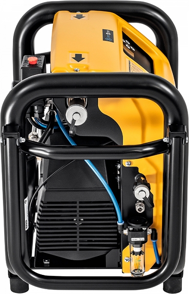 Проверенный мощный безмасляный поршневой компрессор с рычажным приводом и конденсаторным двигателем 230 В, 1500 Вт. Манометр для индикации давления воздуха в ресивере сжатого воздуха. Аварийный выключатель. - Шланги: