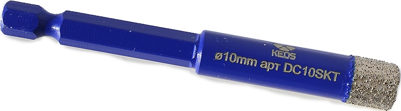 Коронка алмазная по керамограниту Keos Professional Vacuum Brazed 1/4" HEX 10 мм (Кеос Профессионал Вакуум Брейзед 1/4" ХЕКС 10 мм) – корончатое сверло для сверления отверстий Ø 10 мм в керамической плитке, керамограните, граните, мраморе и других видах камня, как на сухую, так и с охлаждающими жидкостями, с использованием сетевых электрических и аккумуляторных дрелей и шуруповертов.
