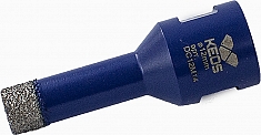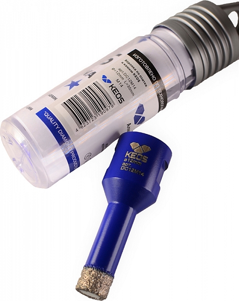 Коронка алмазная по керамограниту Keos Professional Vacuum Brazed M14 12 мм (Кеос Профессионал Вакуум Брейзед М14 12 мм) – корончатое сверло для сверления отверстий Ø 12 мм в керамической плитке, керамограните, граните, мраморе и других видах камня, как на сухую, так и с охлаждающими жидкостями, с использованием сетевых электрических и аккумуляторных УШМ.