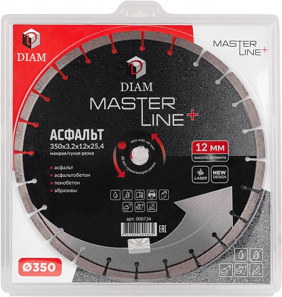 Круг алмазный сегментный Diam Master Line+ 1A1RSS Асфальт 350 мм (Диам Мастер Лайн+ 1А1РСС Асфальт 350 мм) – профессиональный алмазный отрезной диск для сухой и мокрой резки асфальта, асфальтобетона, пенобетона, свежего бетона, кирпича, а также других абразивов на резчиках швов, стенорезных машинах, камнерезных станках, электрических резчиках, бензорезах, как с подачей воды, так и без нее.