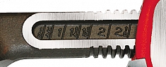 - Деления шкалы верхней щеки показывают приблизительный размер зева ключа для труб различного диаметра