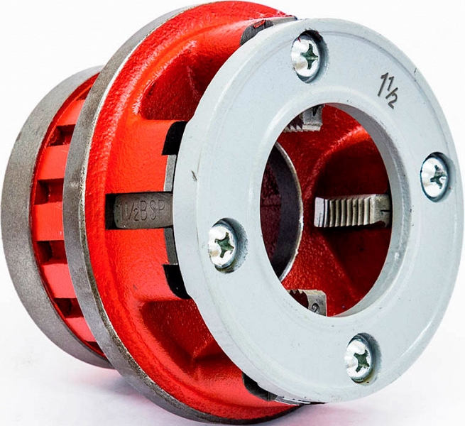 Резьбонарезная головка для ручного клуппа Brexit BSPT R SS 1 1/2" (Брексит БСПТ Р СС 1 1/2") предназначена для нарезки правой трубной конической резьбы BSPT R на стандартных черных стальных водопроводных и газопроводных трубах Ø 1 1/2". Подходит к ручным резьбонарезным клуппам Brexit, а также других производителей (совместимость обязательно уточняйте у специалистов!).