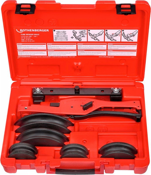Ручной арбалетный трубогиб Rothenberger Tube Bender Maxi Set 12-14-16-18-22 мм (Ротенбергер Тюб Бендер Макси Сет 12-14-16-18-22 мм) предназначен для быстрой и точной гибки до 90° мягких медных и алюминиевых труб, медных труб в оболочке и труб из прецизионной стали, тонкостенных стальных труб, труб из тонкостенной нержавеющей стали Ø 12, 14, 16, 18, 22 мм, толщиной стенки до 1 мм при монтаже систем отопления, водоснабжения, кондиционирования, гидравлических систем, систем подогрева пола и в холодильной технике.