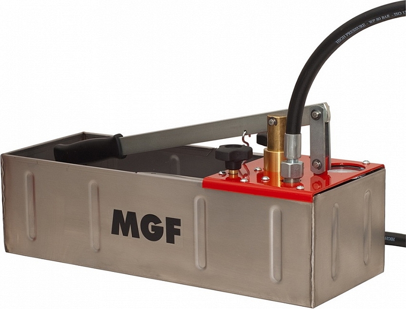 Ручной опрессовщик MGF Dual Compact-60 (МГФ Дуал Компакт-60) – профессиональный ручной испытательный опрессовочный насос с двойным клапаном и горизонтальным резервуаром из нержавеющей стали и манометром для опрессовки, проверки и испытания гидравлических контуров водопроводных, санитарно-гидравлических систем, в соответствии с действующими техническими регламентами, до 60 бар, а также для небольшой перекачки, наполнения и создания давления в закрытых системах. Специально разработан для испытаний и создания давления в гидравлических и водопроводных системах.