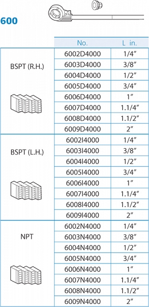 | 600000000 | Резьбонарезная трещотка | 1/4" – 1 1/4" | BSPT, NPT | R / L (Правая / Левая) |