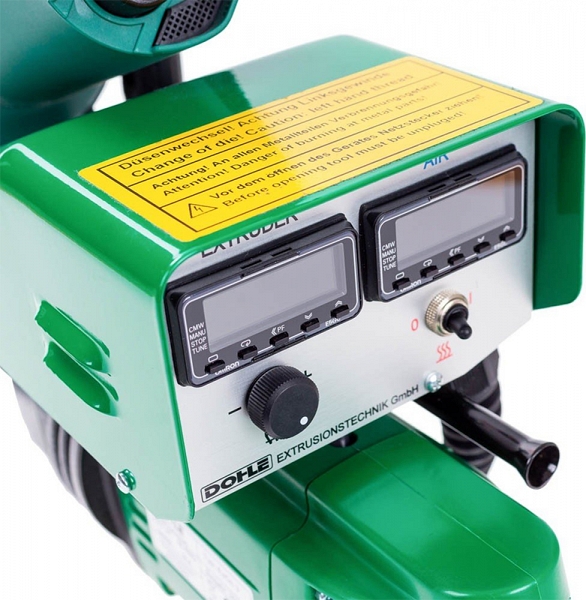 Высокопроизводительный ручной сварочный экструдер модели ExOn 3 от производителя Dohle (Германия) имеет раздельную систему нагрева экструзионного расплава и свариваемого материала. Так как шнек и камера пластификации данного экструдера изготовлены из материалов, стойких к агрессивным средам, это позволяет сваривать им такие сложные материалы как ПВХ и ПВДФ, а также ПП и ПЭ. Раздельная система нагрева имеет преимущество, так как дает возможность отдельно регулировать и контролировать на дисплеях контроллеров температуру расплава в экструзионной камере и температуру воздуха для прогрева свариваемого материала. Благодаря раздельной системе нагрева возможна более гибкая настройка сварочных параметров экструдера под различные условия эксплуатации, это позволяет работать как в цеху, так и на открытом воздухе при неблагоприятных погодных условиях.
