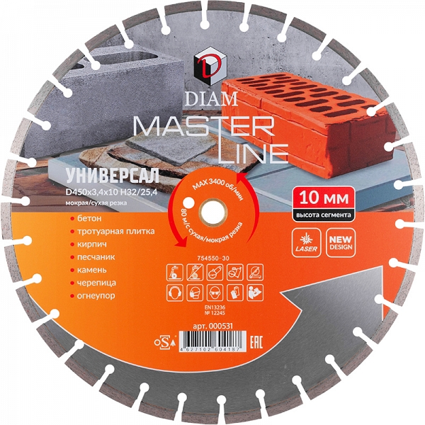 Сегментный алмазный круг Diam Master Line 1A1RSS Универсал 450 мм (Диам Мастер Лайн 1А1РСС Универсал 450 мм) – специальный алмазный отрезной диск с лазерной сваркой сегментов для сухой и мокрой резки бетона, тротуарной плитки, кирпича, черепицы, песчаника, природного и искусственного камня, строительных материалов общего назначения на камнерезных станках, стенорезных машинах, швонарезчиках, с подачей и без подачи воды.