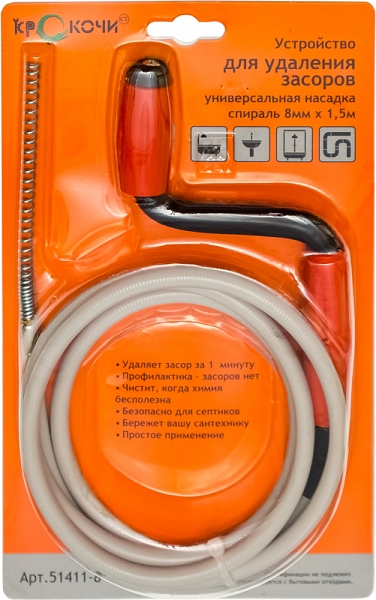 Трос для прочистки канализационных труб Крокочист 8 мм × 1,5 м (Crocochist 8 mm × 1,5 m) – спираль в виниловой оплетке с универсальной насадкой и удобной рукояткой для вращения для прочистки канализации Ø до 50 мм, длиной до 1,5 м.