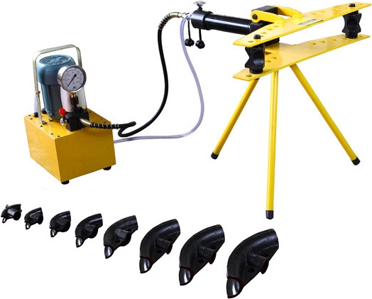 - Трубогиб электрогидравлический имеет стандартное комплектование, включающее в себя набор башмаков с разным сечением и треногу-подставку;